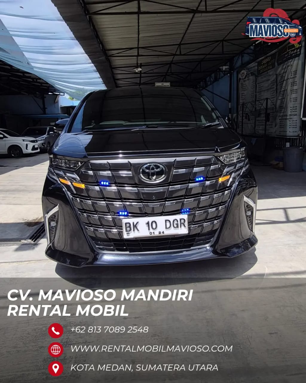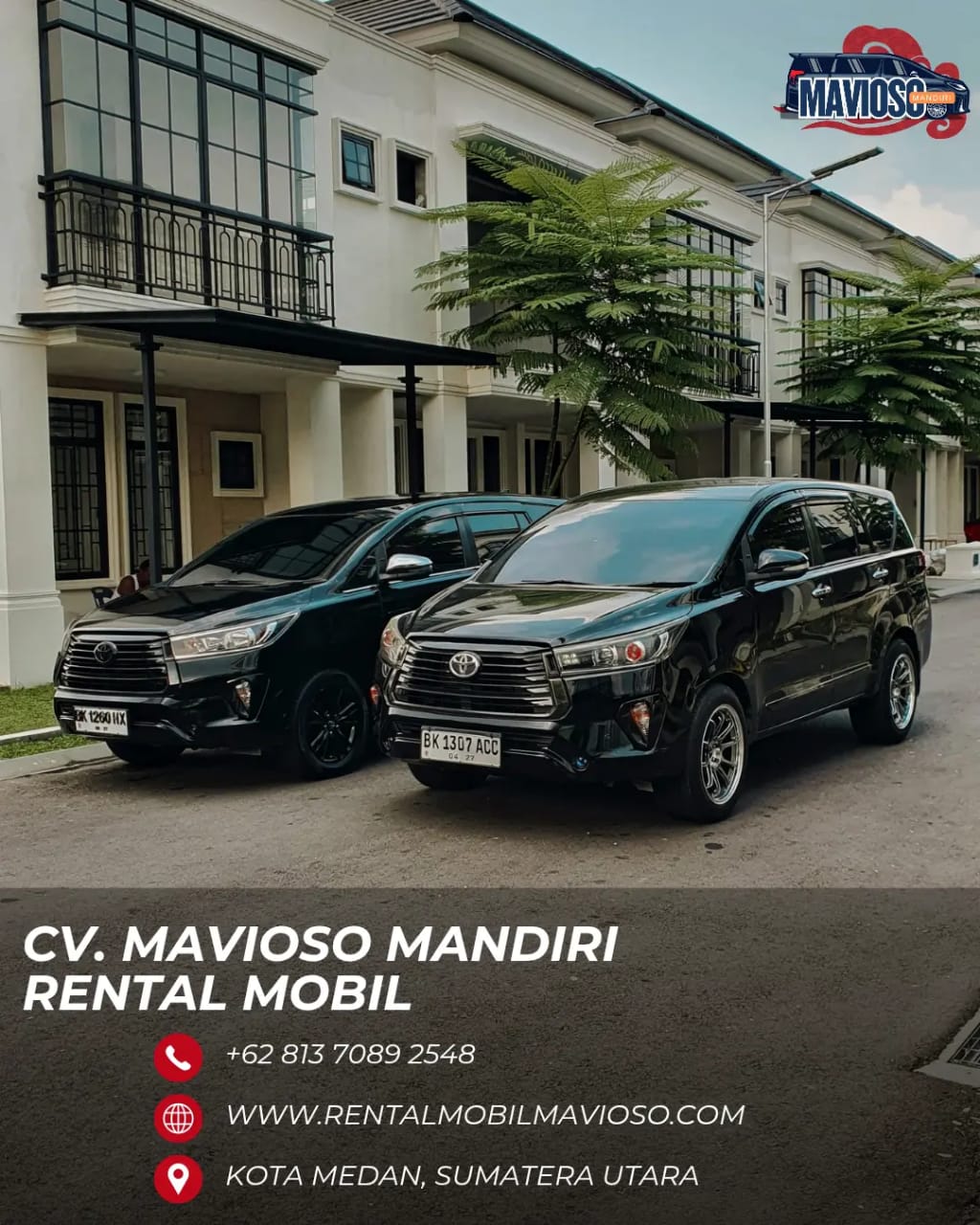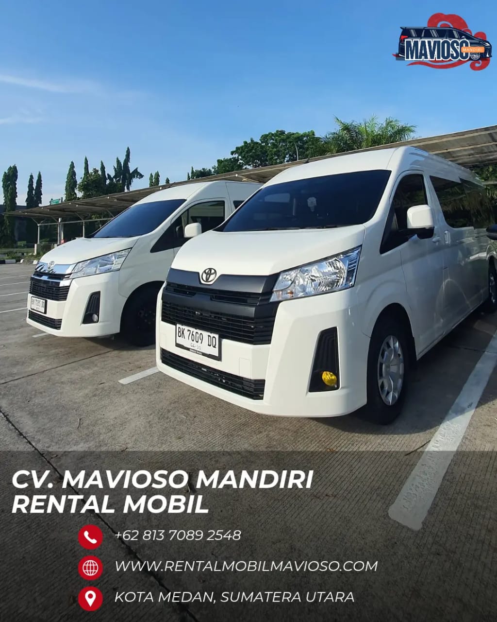 CV. Mavioso Mandiri adalah perusahaan rental mobil Medan yang berkomitmen memberikan layanan transportasi berkualitas untuk berbagai kebutuhan perjalanan Anda di Kota Medan dan Sumatera Utara. Kami menghadirkan solusi sewa mobil murah di Kota Medan dengan pilihan armada yang lengkap dan terawat, mulai dari kendaraan keluarga yang nyaman hingga mobil mewah untuk keperluan bisnis, event, dan wisata. Layanan kami meliputi Rental Land Cruiser Medan, Rental Alphard Medan, Rental Mobil Pengantin Medan, serta armada populer lainnya seperti Fortuner, Innova Reborn, Avanza, dan Hiace yang siap menemani perjalanan Anda dengan aman dan nyaman.